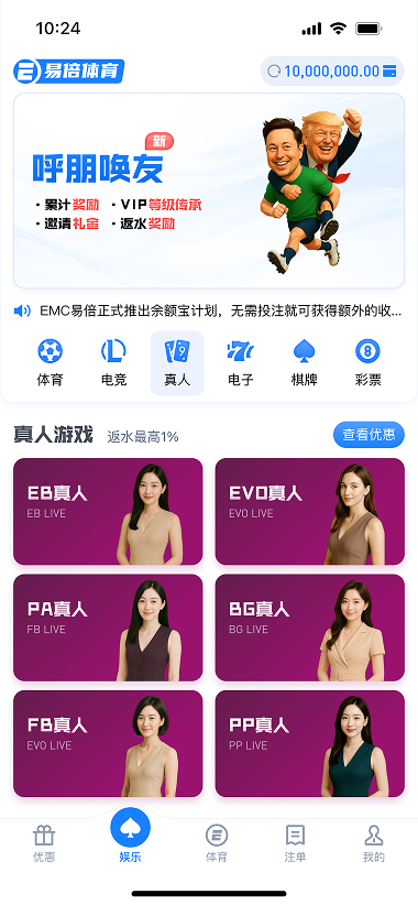 公告: 1、体育热搜关键词征集活动 2、电竞五重礼!S15决战巅峰即将开幕 3、庆中秋国庆 上易倍博饼 状元插金花 4、五大联赛天天送! 5、五大联赛冠军竞猜 立返50% 最高1288元! 6、EMC霸王餐100%包赔! 7、关于禁止国家队、俱乐部等相关职业成员参与游戏的声明 8、风控提醒 9、【EMC防诈骗】重要提示